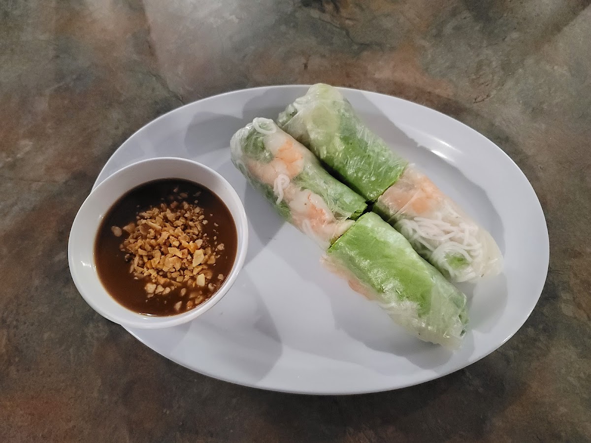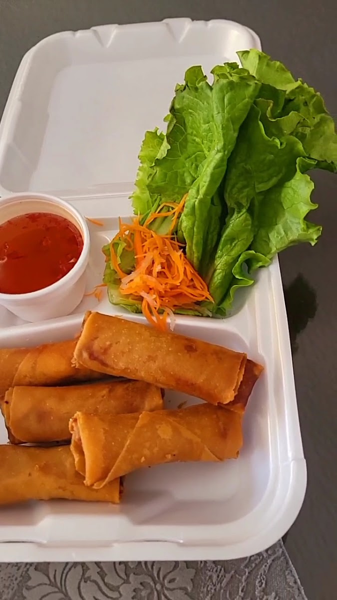 I love their grilled marinated chicken strips "Spring Rolls! 1 order comes with 2 of them and is large in size, it also comes with a side of peanut sauce which has real peanuts for crunch! I also ordered 2 orders of fried egg rolls they were crispy with a good quantity of fresh lettuce pickled carrots and tangy dipping sauce. Both rolls were delicious and not expensive.